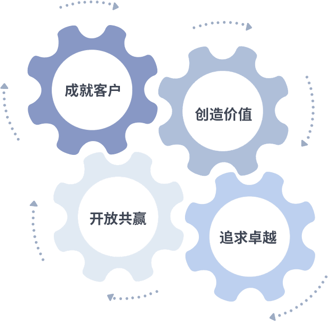 成就客户是一切决策的出发点,,创造价值是衡量所有工作的标准,,追求卓越是我们做事做人的态度,,,,开放共赢是我们的格局也是最终的结果。。。价值观的齿轮环环相扣,,,,推动着组织里的每个人不断向前。。。。
